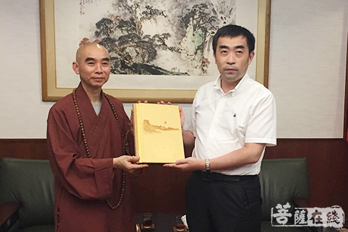 宁波市佛教协会会长、天童禅寺方丈诚信法师向中华人民共和国驻大阪总领馆刘磊副总领事赠送宁波五大寺院的邮票纪念册
