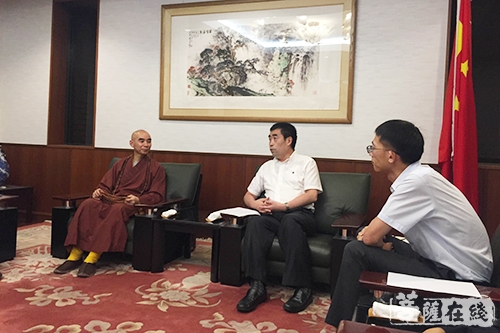 宁波市海曙区民宗局副局长周国平;宁波市佛教协会副会长、五磊讲寺方丈宗立法师;宁波市佛教协会副会长、观宗讲寺住持印超法师;宁波市佛教协会常务理事、七塔禅寺副监院常明法师;中国佛教艺术专业委员会副会长王艳军;梁皇寺监院智良法师等陪同拜访。