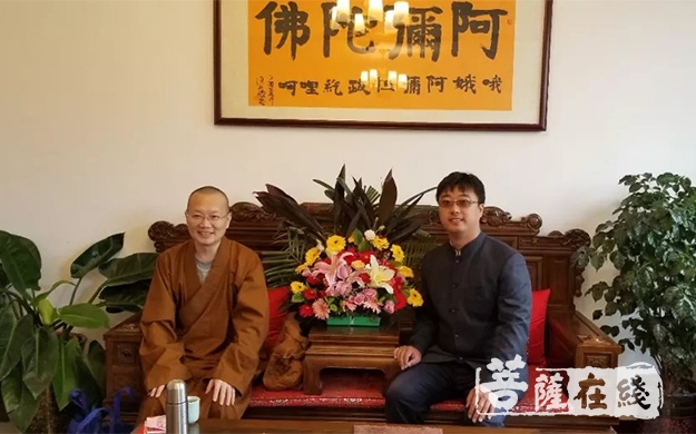 大愿大和尚与王鹏飞在九圣寺会客室交谈