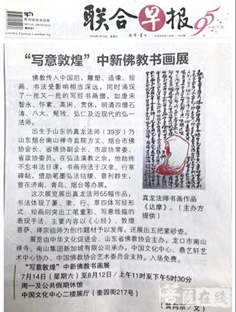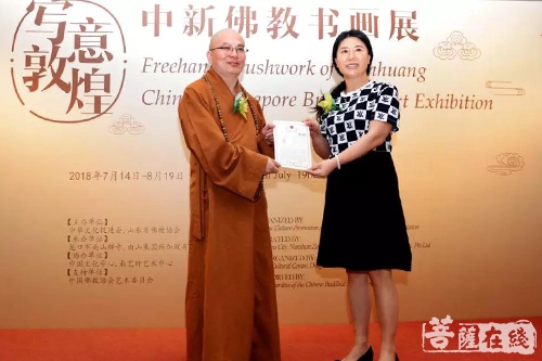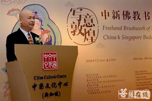 为弘扬中国传统文化,加强中新两国间的文化艺术交流,“写意敦煌”中新佛教书画展首度跨出国门,将海外之旅第一站设在新加坡,并于2018年7月14日上午在中国文化中心举行开幕仪式。展览由中华文化促进会主办,龙口市南山禅寺、南山集团新加坡有限公司承办,中国文化中心、鼎艺轩艺术中心协办,并得到中国佛教协会艺术委员会的大力支持。