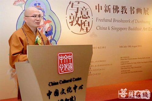 纯一大和尚代表中国佛教协会、佛教协会艺术委员会向真龙法师表示祝贺。并肯定了真龙法师“写意敦煌”中新佛教书画展对加强两国佛教文化交流的积极意义。他在致辞中说到:此次书画展览标志着中国、新加坡两国佛教文化进入新历程,是我国第一次有本土法师远赴新加坡以此种形式进行佛教文化交流,可谓是第一人。