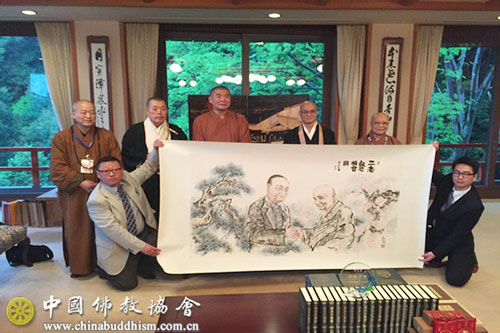 在结束对唐招提寺的参访之后,代表团一行到了第二站黄檗山万福寺。黄檗山万福寺是日本禅宗三宗(黄檗、临济、曹洞)之一的黄檗宗大本山。开山祖师是曾经担任过福建黄檗山万福寺住持,后应日本多次邀请,于公元1654年东渡日本传法的隐元隆琦禅师。习近平总书记在2015年5月23日出席中日友好交流大会时曾说过:“在日本期间,隐元大师不仅传播了佛学经义,还带去了先进文化和科学技术,对日本江户时期经济社会发展产生了重要影响。”在与万福寺庶务部长服部润承座谈期间,代表团团长湛如法师表示,隐元禅师不仅将佛法带到了日本,也给日本带来了包括美术、医术、煎茶、普茶料理在内的各种文化,深深影响了江户时代的日本文化。在去年日本黄檗宗代表团访华期间,学诚会长曾亲书墨宝“赞佛偈”赠与代表团。希望通过此次访问,进一步加强万福寺与中国佛教界的交流,共同谱写友好交流的新篇章。