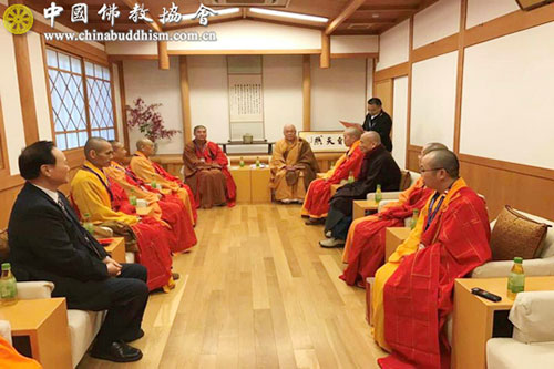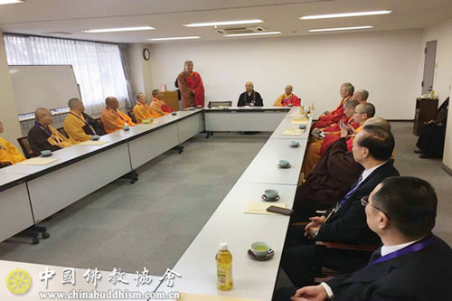 代表团当日抵达的最后一站是音羽山清水寺。清水寺不仅是1974年成立的“日中友好佛教协会”所在地,同时也是1994年为响应中国佛教系会前任会长赵朴初居士为加强东亚佛教间“黄金纽带”关系、倡议召开中韩日佛教友好交流会议而成立的“日中韩国际佛教交流协议会”事务局所在地。日中韩国际佛教交流协议会是目前与大陆佛教界交往最多、最广泛的日本佛教团体。参访期间,代表团一行受到了日中韩国际佛教交流协议会理事长武觉超长老和事务局局长大西真兴长老的热烈欢迎和接待。在会谈中,代表团团长湛如法师首先对武觉超理事长和大西真兴先生拨冗接待表示感谢,同时表示,清水寺作为“日中韩国际佛教交流协议会”事务局所在地,点滴所在之处都有包括赵朴老、大西良庆在内的两国老一辈佛教界友好人士的气息。希望通过此次访问,可以继续秉承老一辈的友好理念,进一步加深双方的交流,为中日两岸佛教界的友好交流共同携手努力。